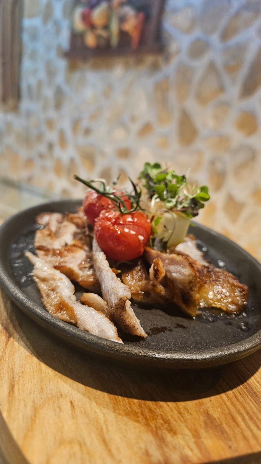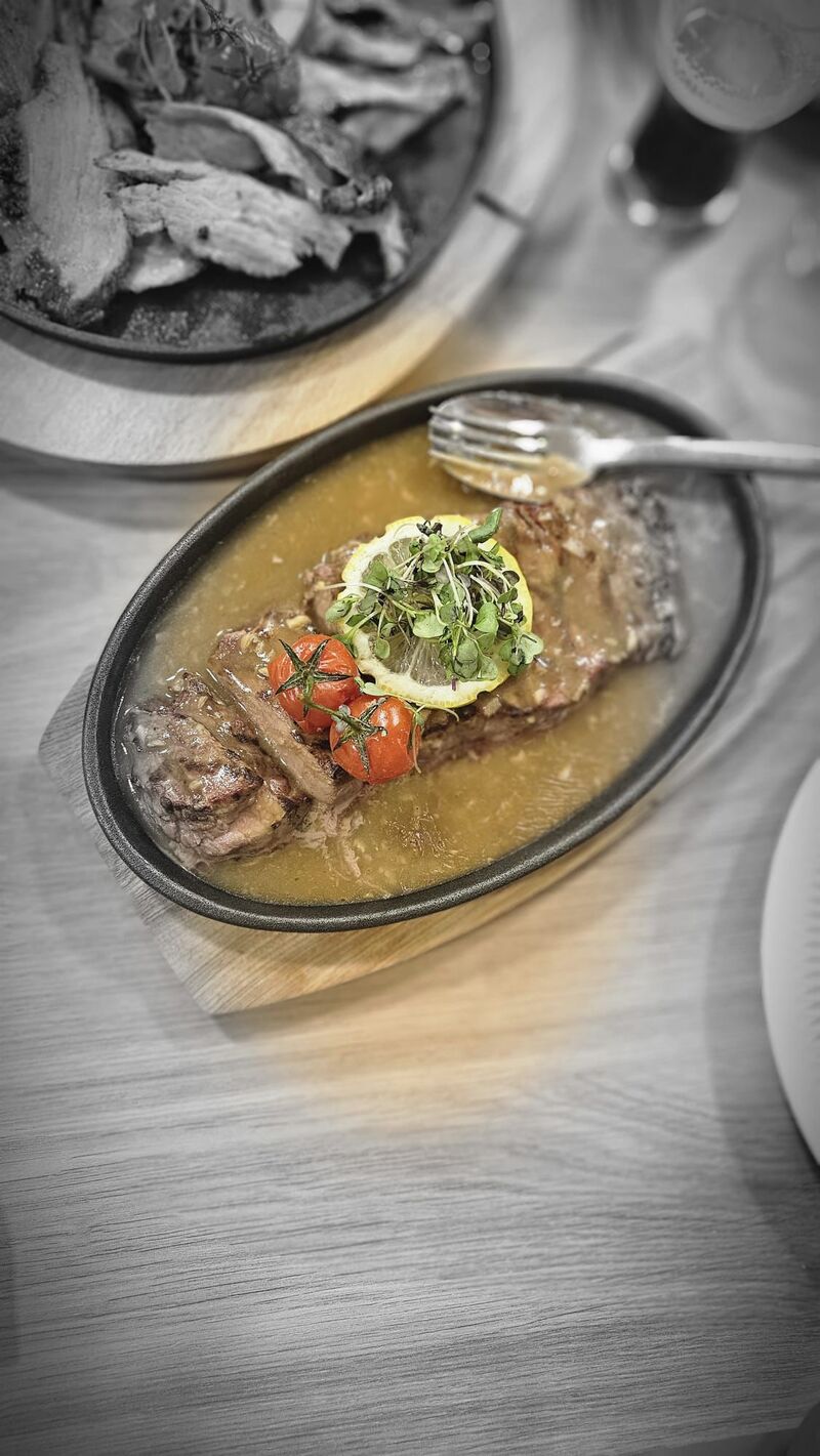 A ementa destaca-se pela cozinha tradicional portuguesa, com pratos como bacalhau à lagareiro, filetes de polvo e picanha, todos bem servidos e saborosos.